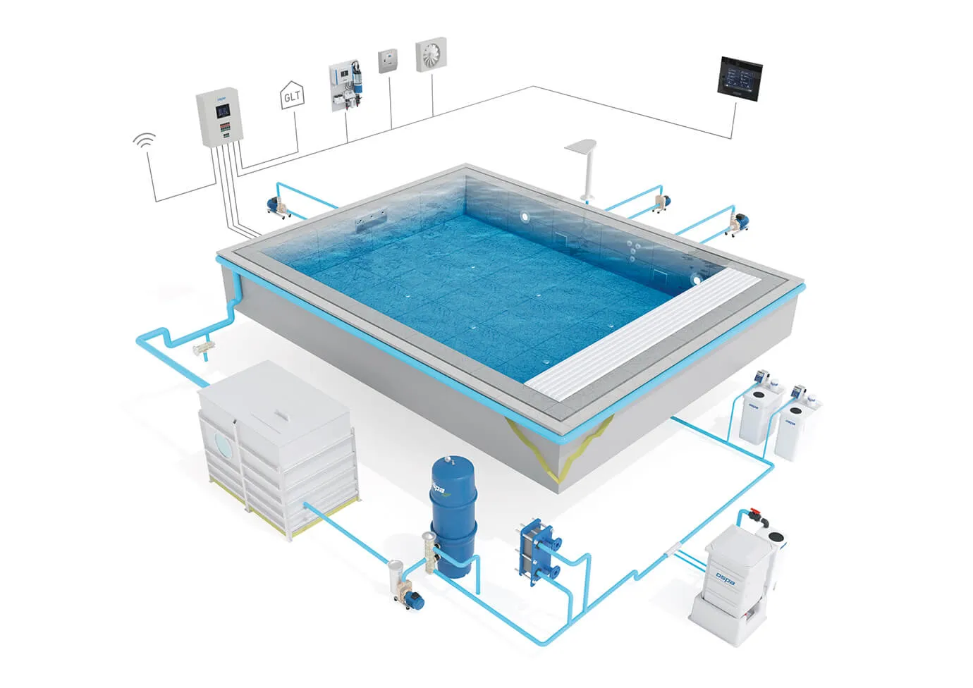 Un buen filtrado es la piedra angular de una desinfección efectiva. Los filtros EcoClean de Ospa están diseñados con varias capas (gruesa, fina y carbón) que aseguran la retención de sustancias contaminantes. Además, su sistema de difusión de agua garantiza que no quede suciedad almacenada, ya que el agua recorre cada rincón del filtro. Gracias a nuestras bombas supersilenciosas de velocidad variable, se ajusta la velocidad de filtrado (30-48 m/h) y lavado (50-60 m/h) para un rendimiento óptimo. - Desinfección (BlueClear)