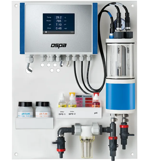 Las sustancias orgánicas que el filtro no retiene son eliminadas por el sistema de desinfección BlueClear, que utiliza cloración indirecta con dióxido de cloro (CLO2). Este desinfectante, producido a partir de sal natural, es eficaz y proporciona un agua de alta calidad, suave y enriquecida con oxígeno. Además, el sistema BlueControl® 5 Web automatiza la dosificación de cloro, manteniendo los niveles óptimos de manera constante. - Regulación de pH