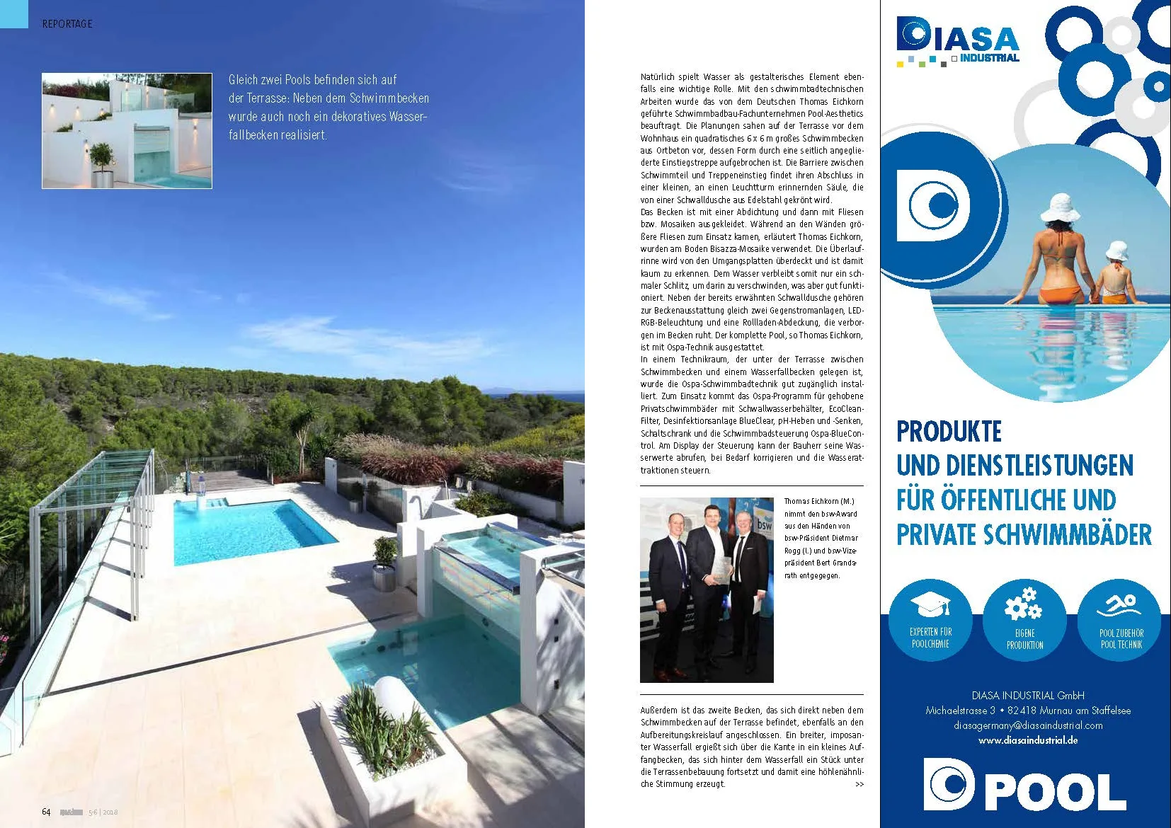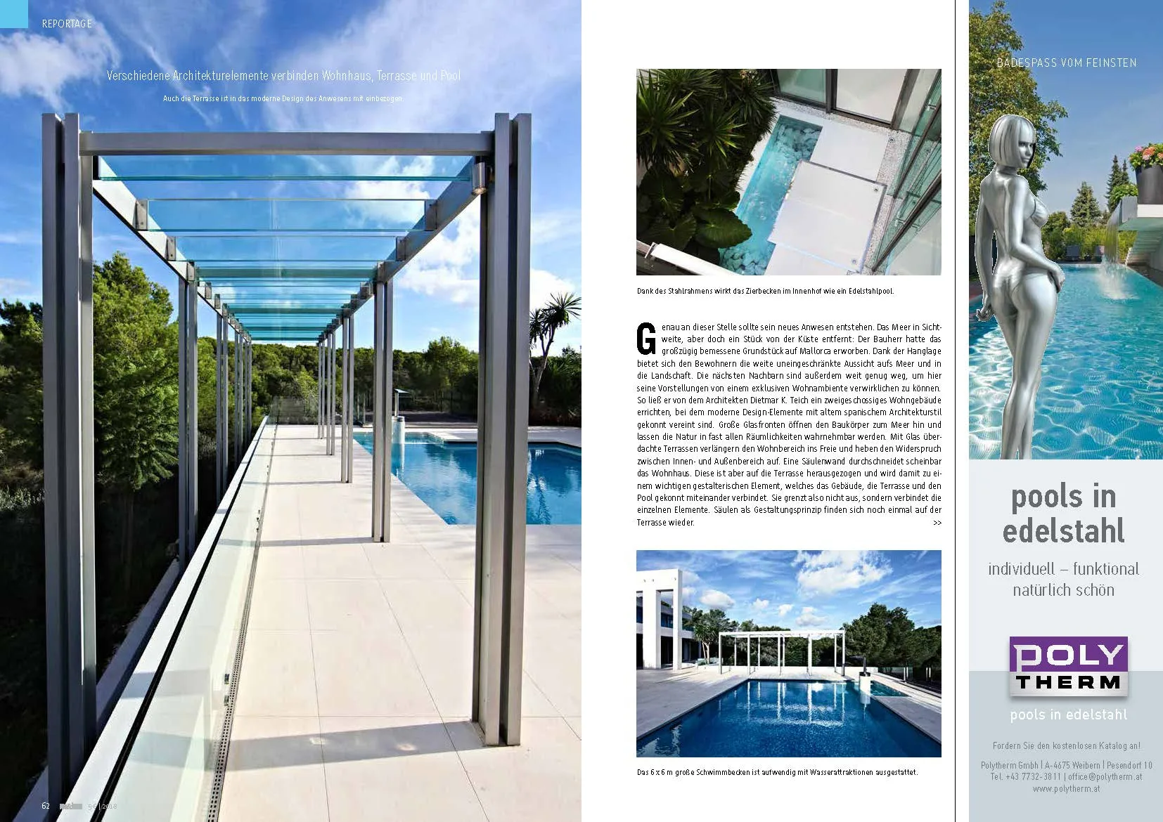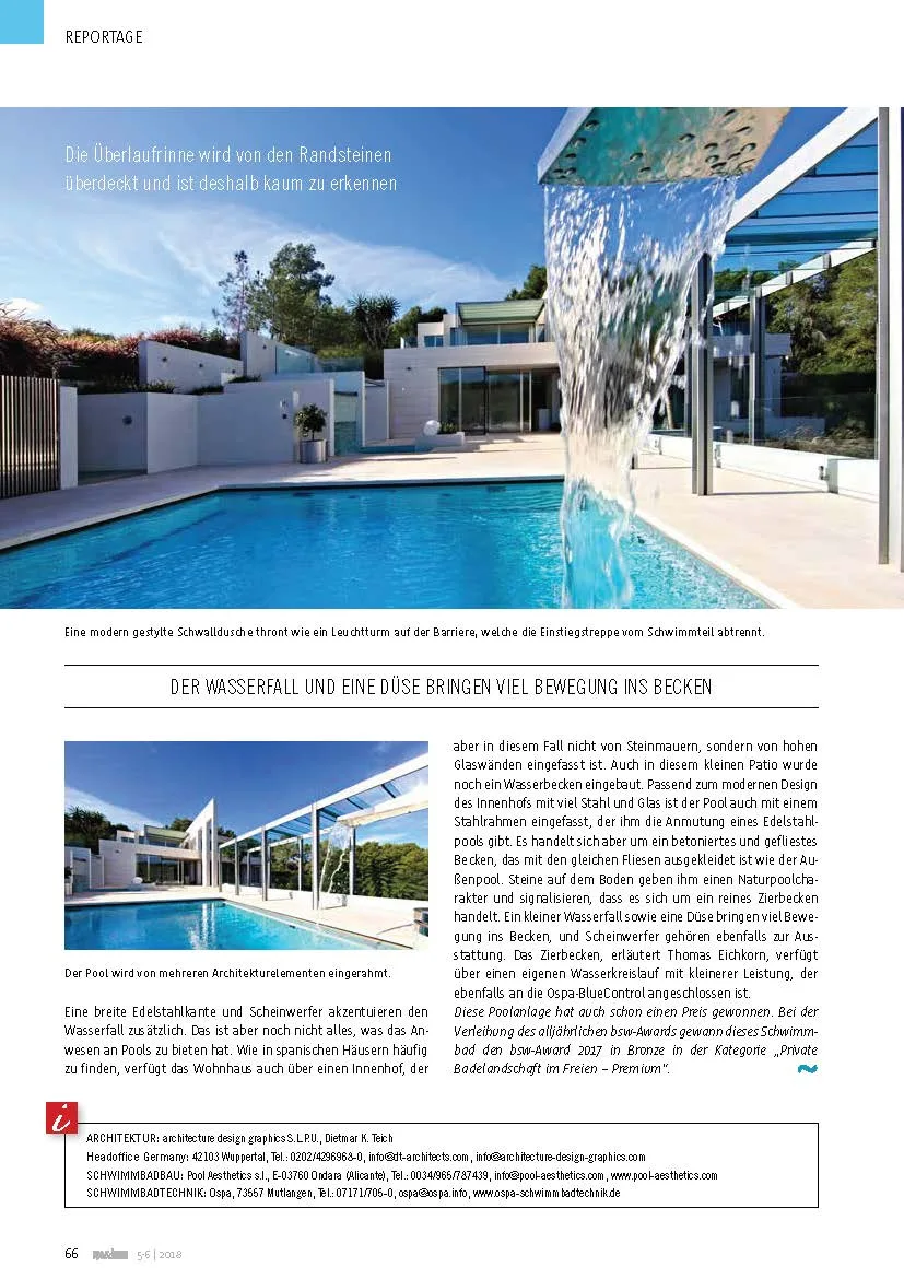 «Island Feeling» es el nombre del nuevo reportaje, publicado en la revista especializada «spa & home». Este objeto consiste en una piscina de 6x6m con atracciones acuáticas, una piscina decorativa en el patio y dos piscinas decorativas escalonadas en la terraza. Esta propiedad ha sido galardonada con el BSW-Award 2017.